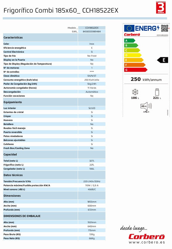 Combi Corbero CCH18522EX, 185x60cm, NFR, E, Blanco
